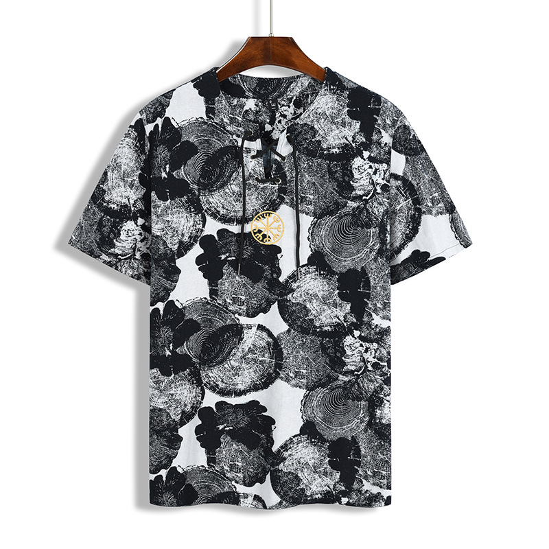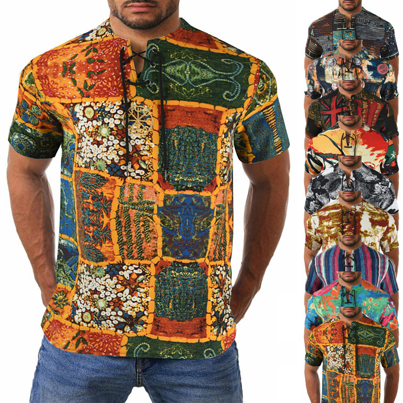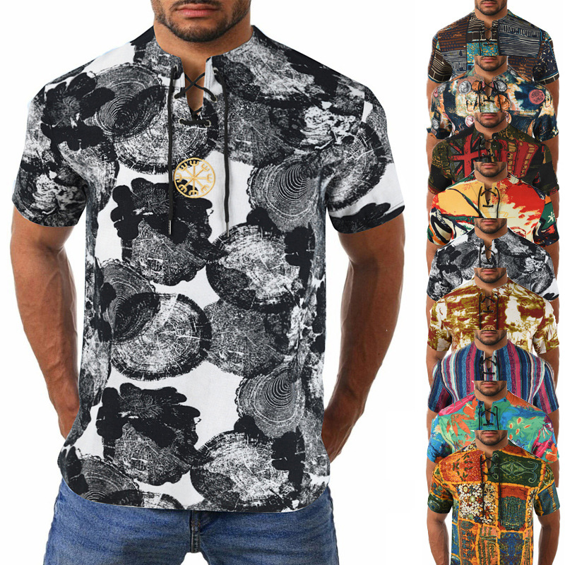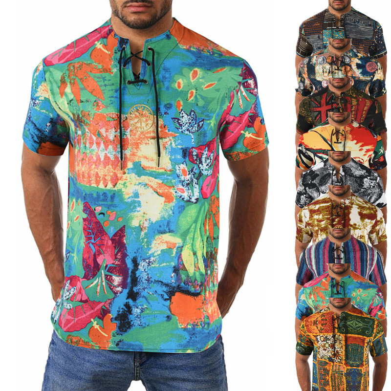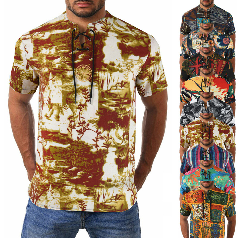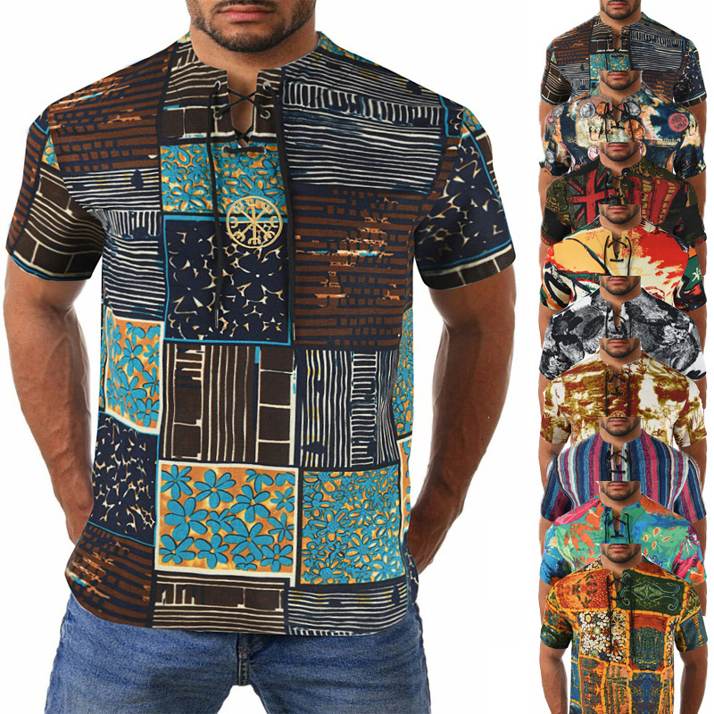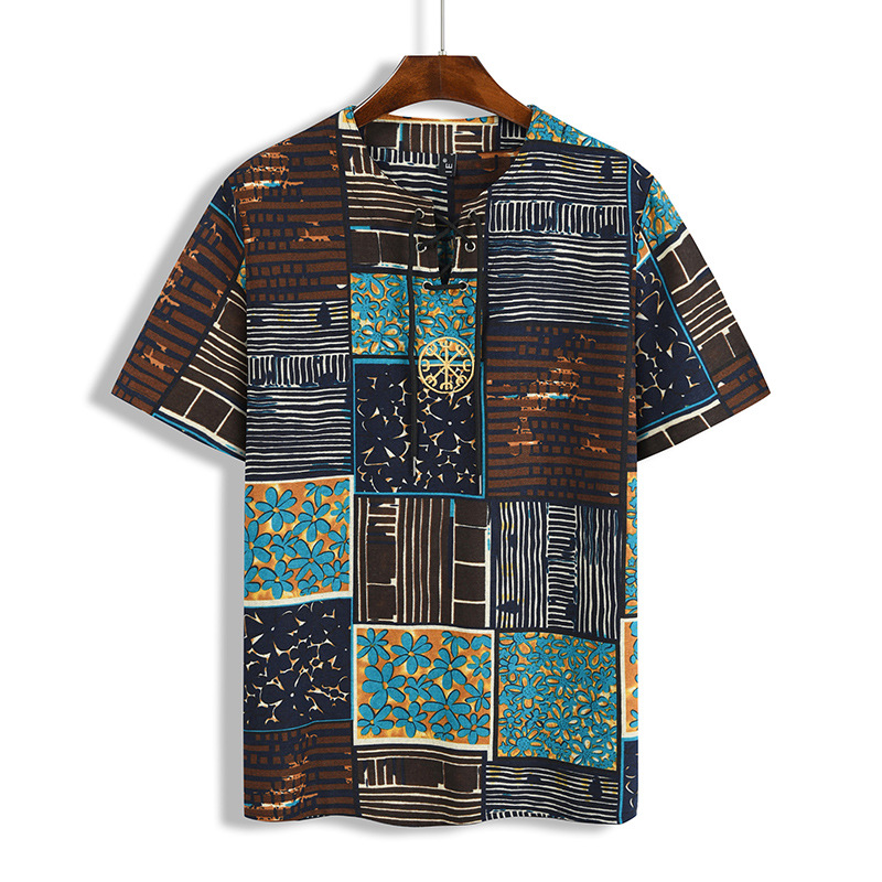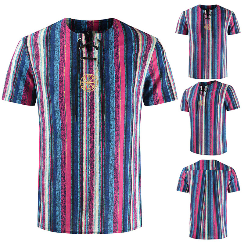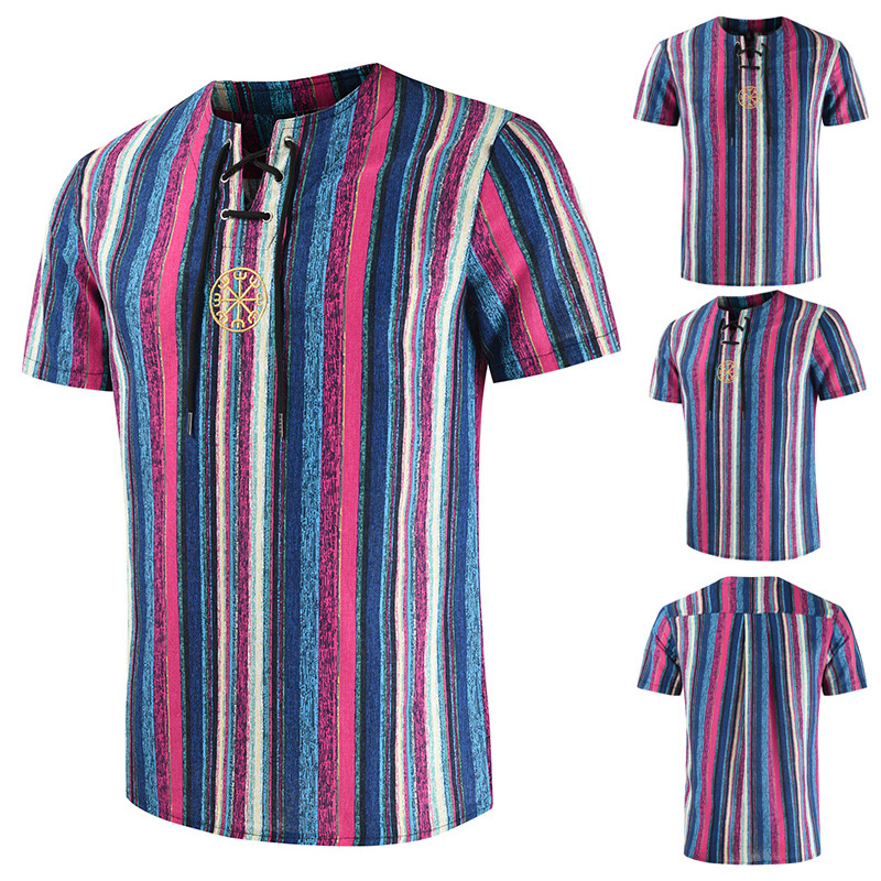 • 2024 Summer Cross-Border Wish Cotton and Linen Embroidered Short-Sleeved Shirt Slimming Look Stripesd Printed Pullover Round Neck Cotton and Linen Shirt