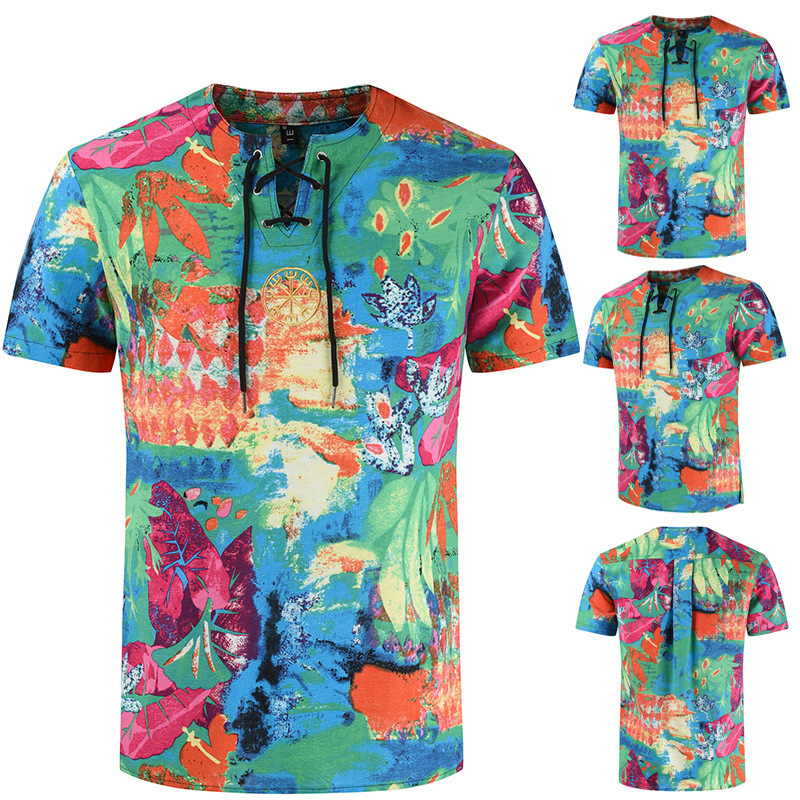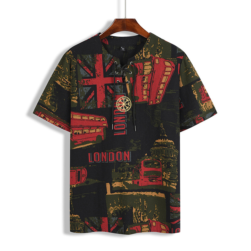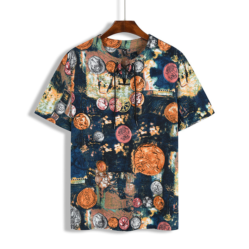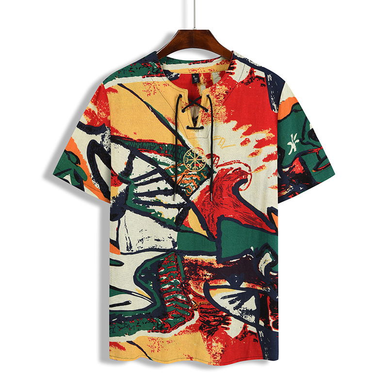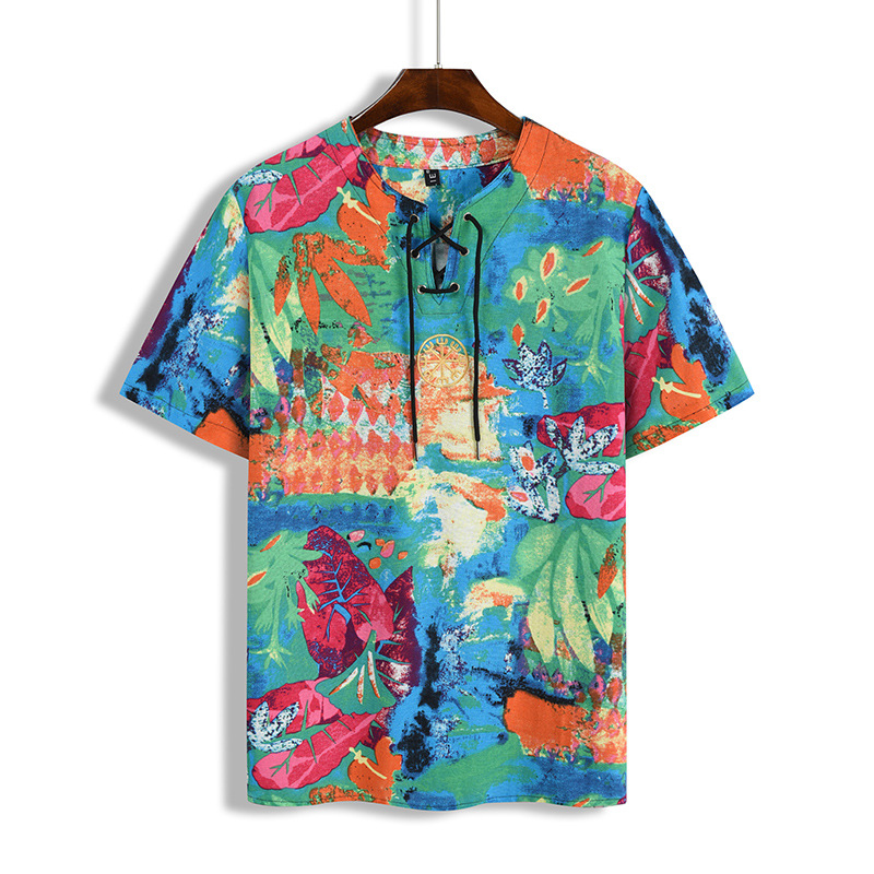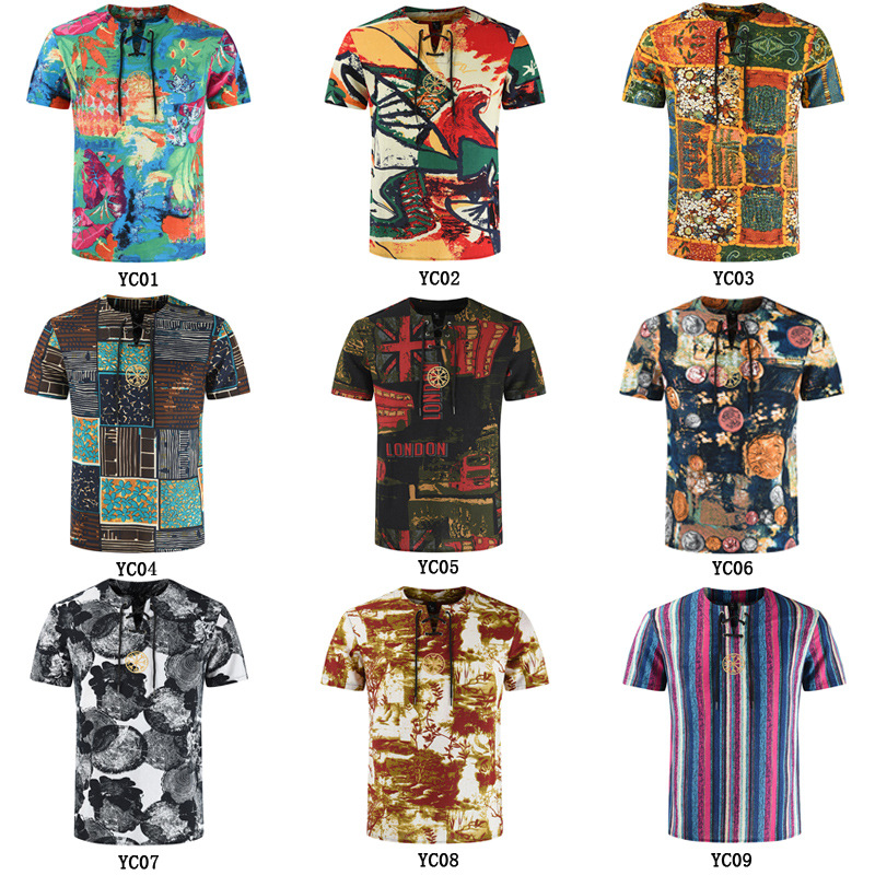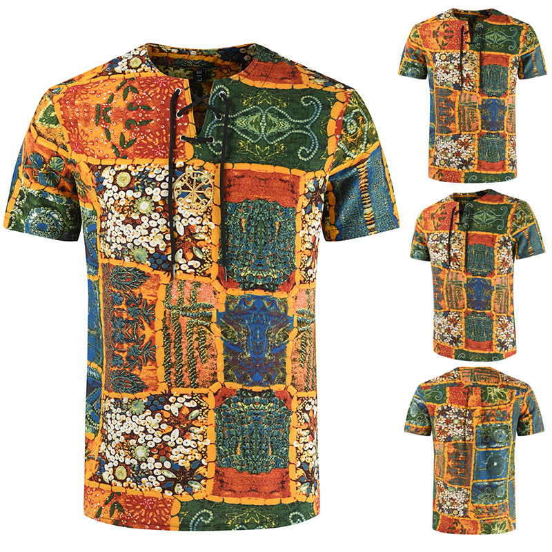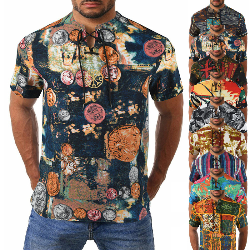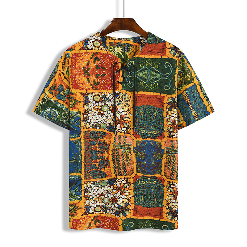• 2024 Summer Cross-Border Wish Cotton and Linen Embroidered Short-Sleeved Shirt Slimming Look Stripesd Printed Pullover Round Neck Cotton and Linen Shirt