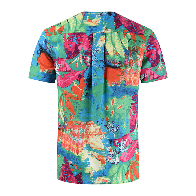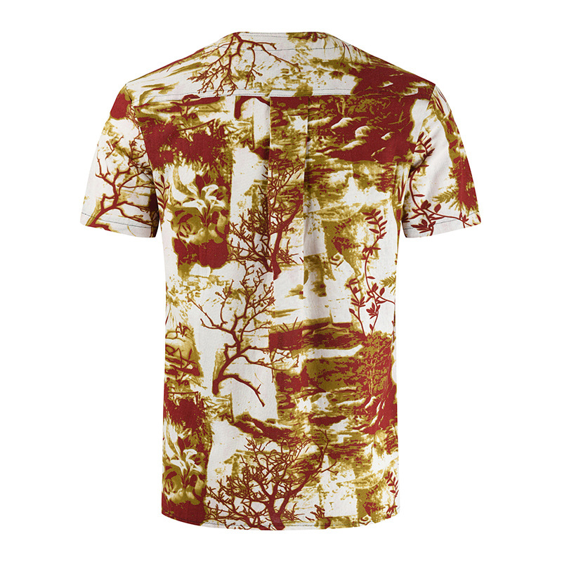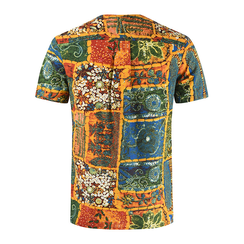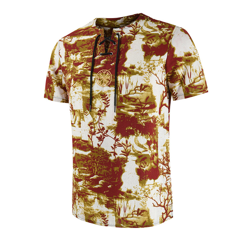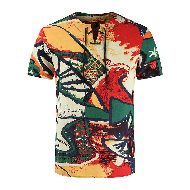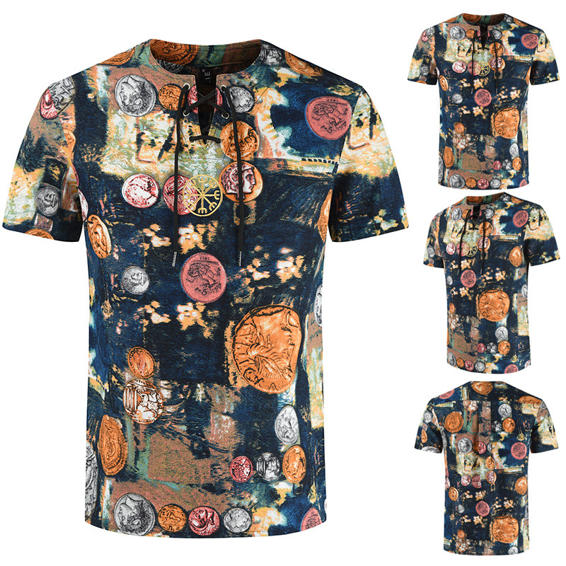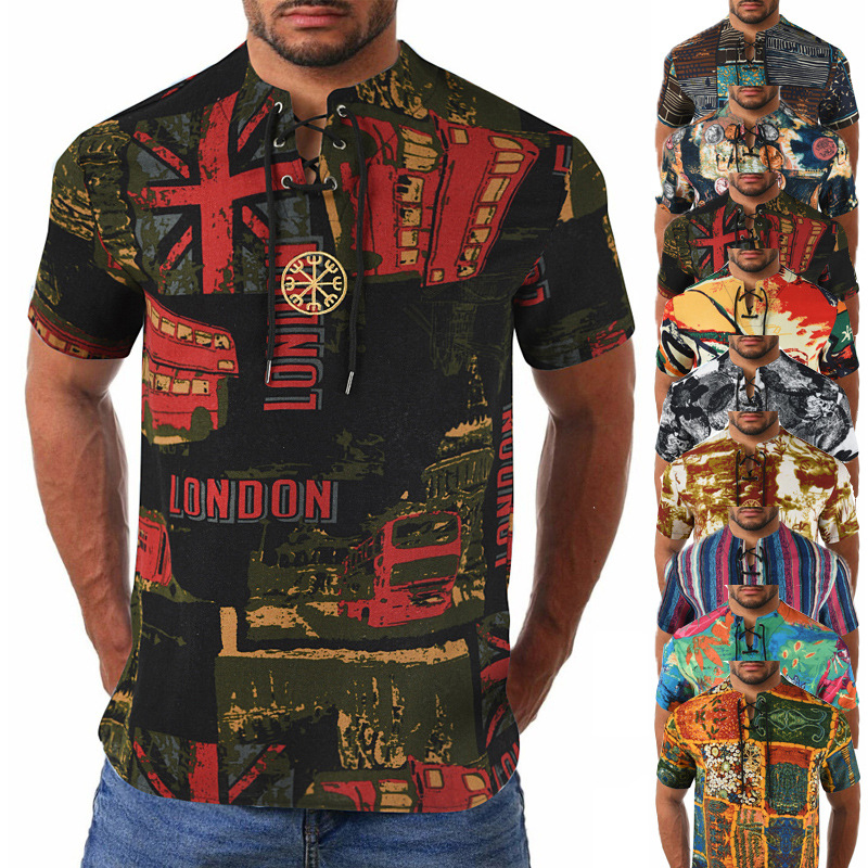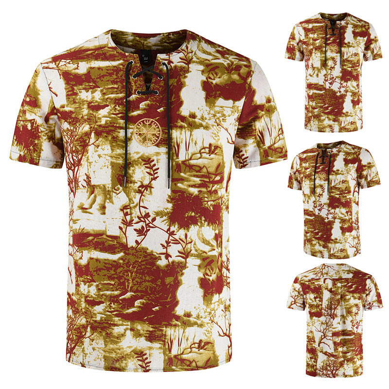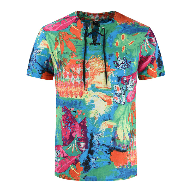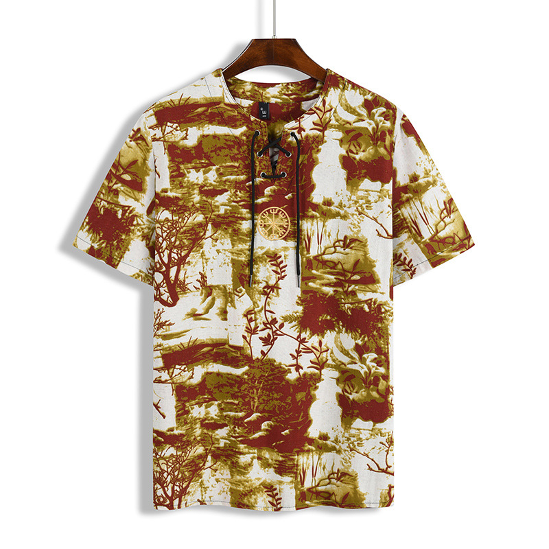 • 2024 Summer Cross-Border Wish Cotton and Linen Embroidered Short-Sleeved Shirt Slimming Look Stripesd Printed Pullover Round Neck Cotton and Linen Shirt