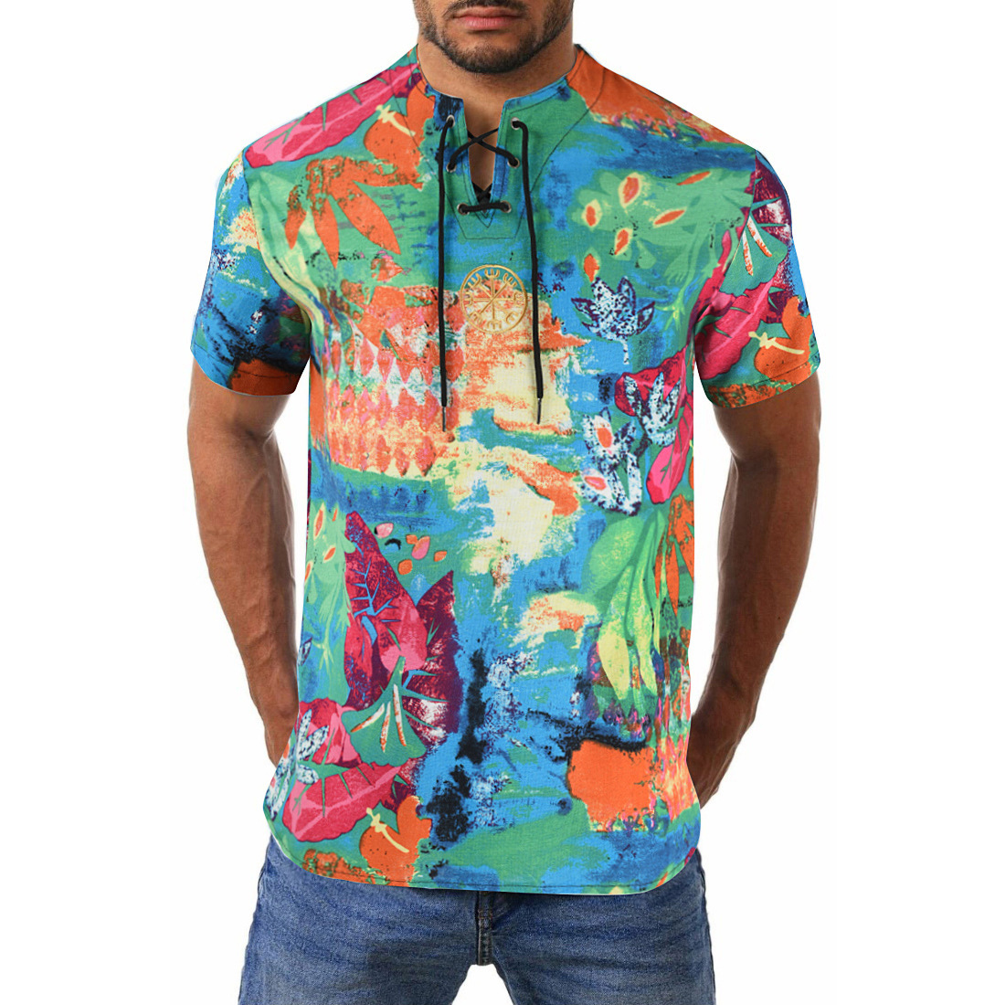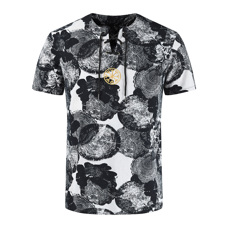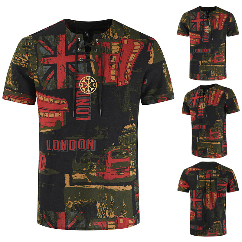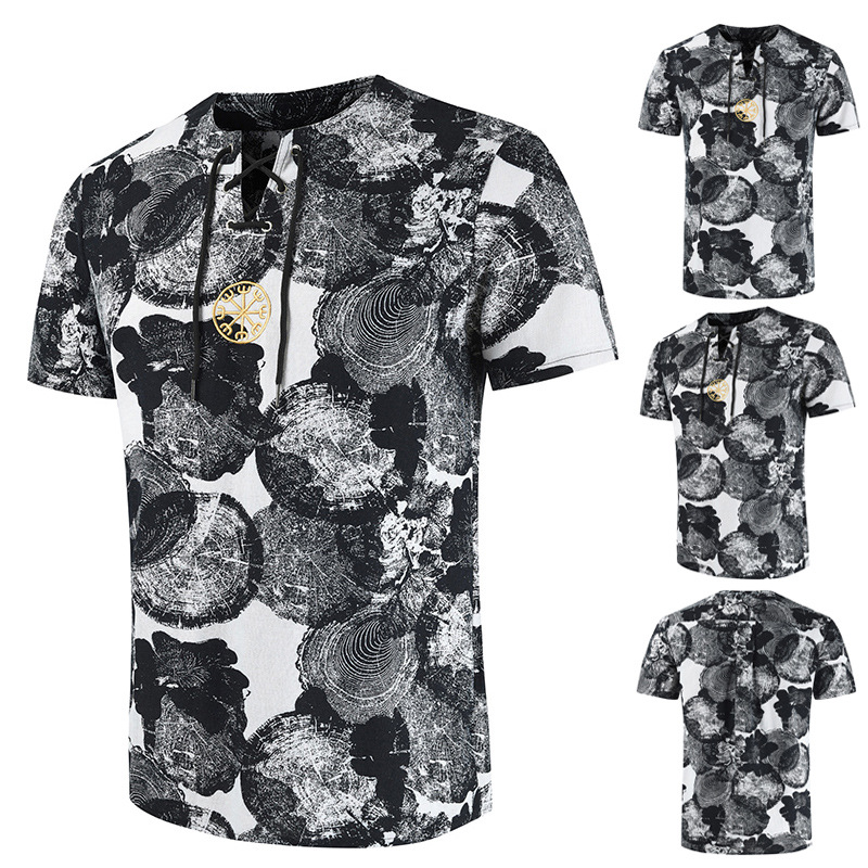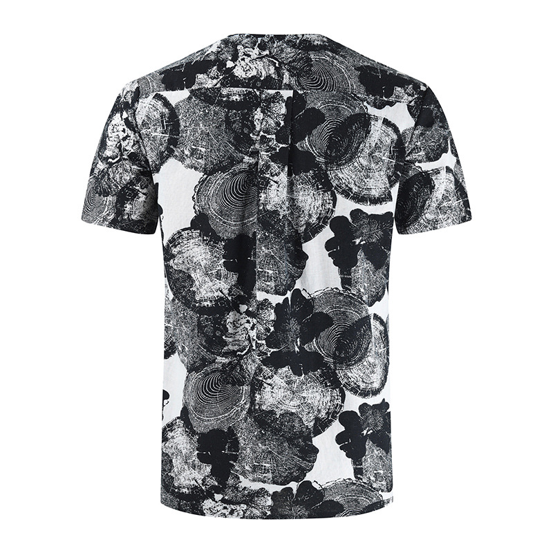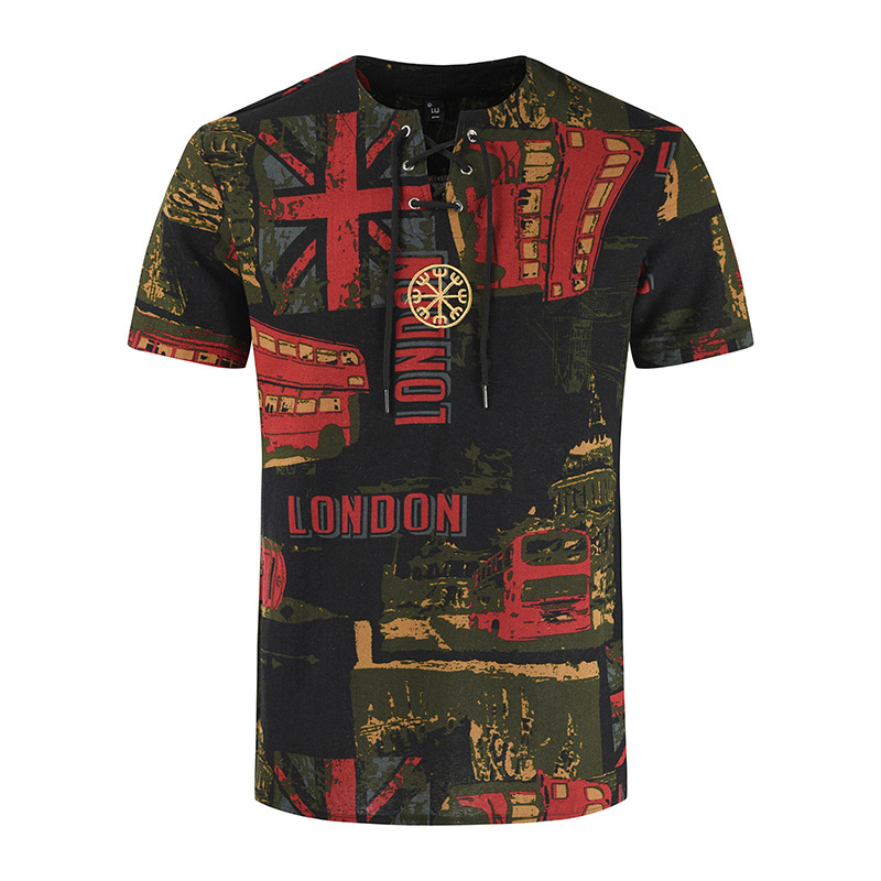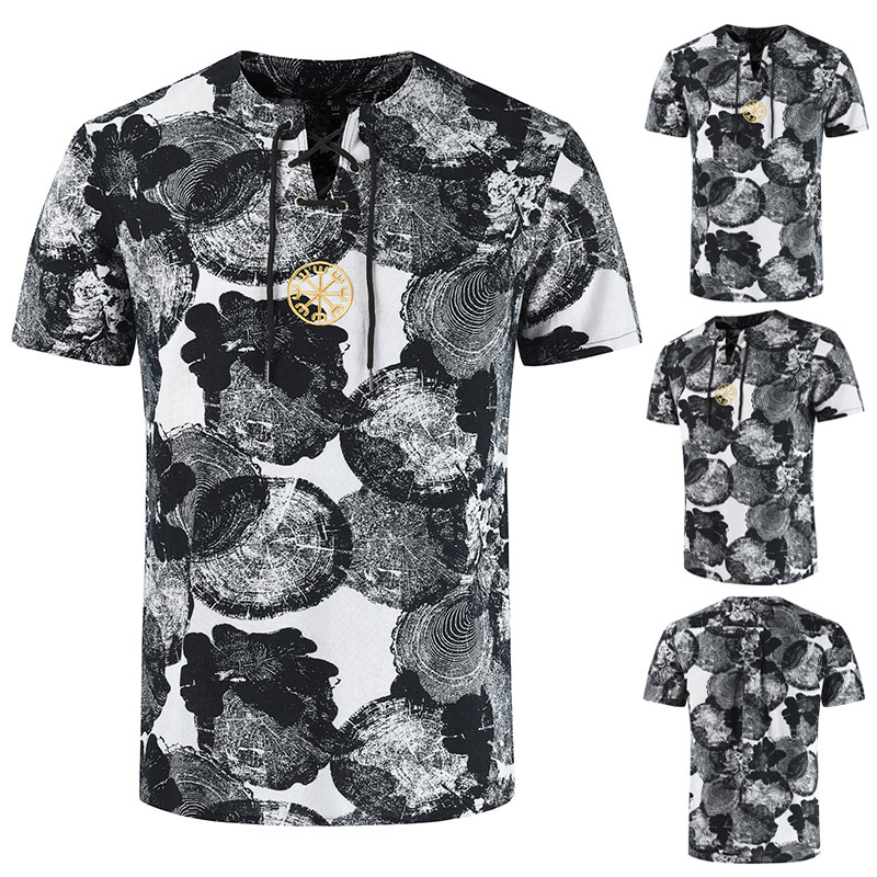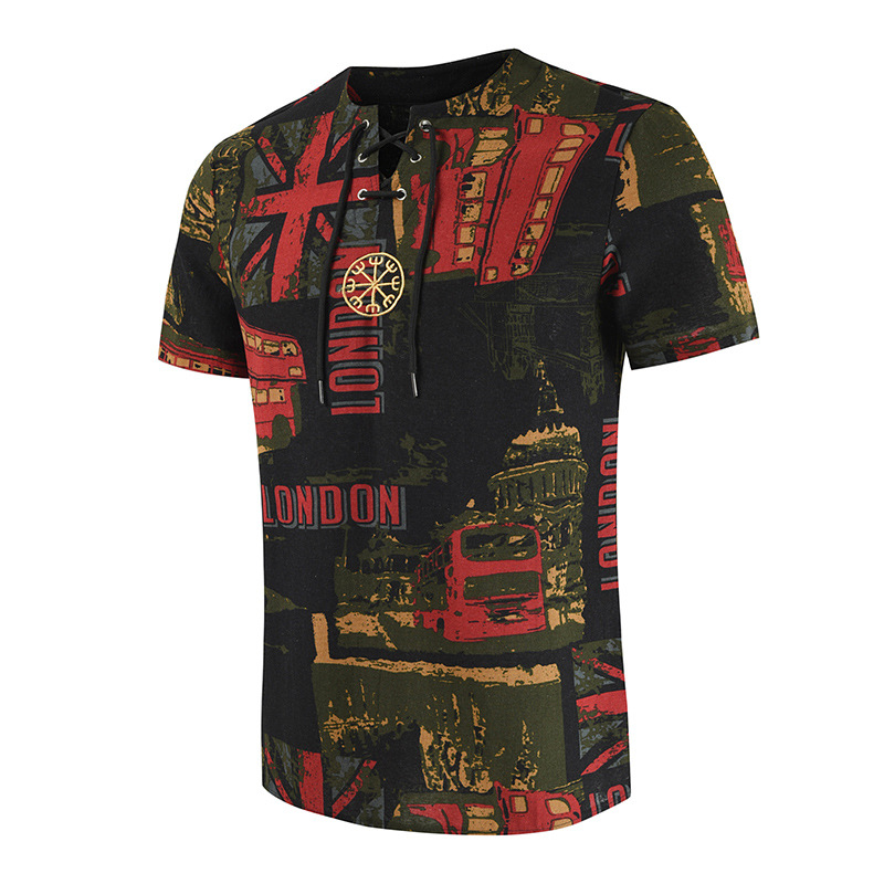 • 2024 Summer Cross-Border Wish Cotton and Linen Embroidered Short-Sleeved Shirt Slimming Look Stripesd Printed Pullover Round Neck Cotton and Linen Shirt