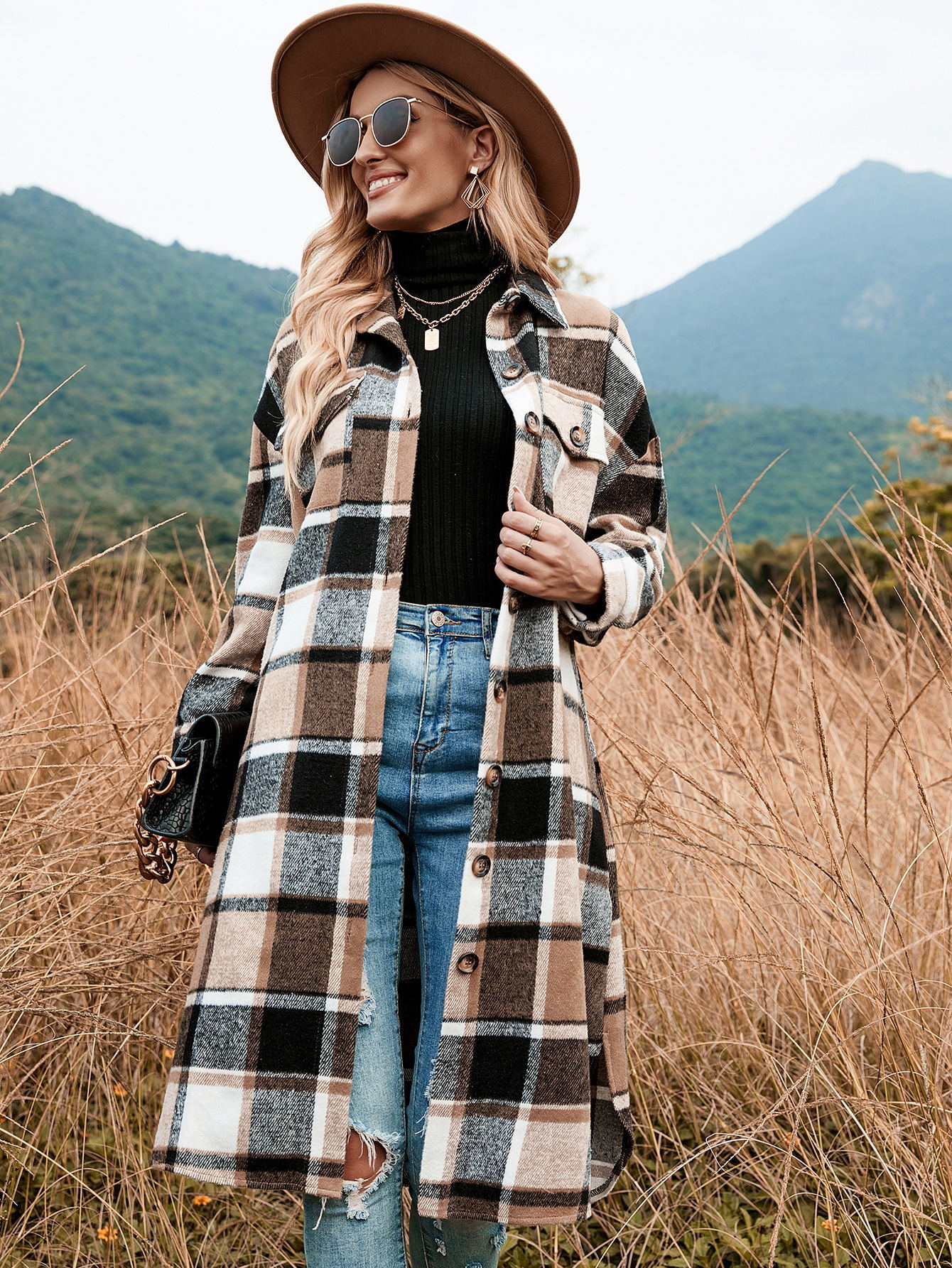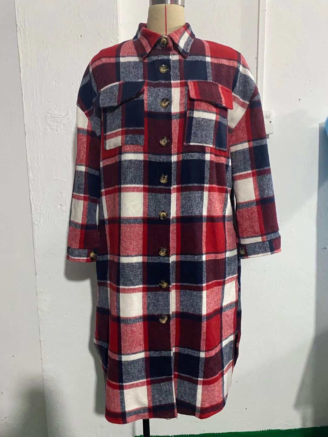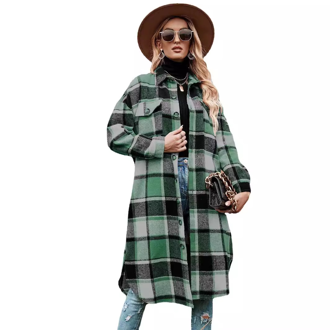 2022 Autumn and Winter European and American Style Windbreaker Jacket Side Slit Lapel Loose Woolen Plaid Jacket Real Shot Ready Stock