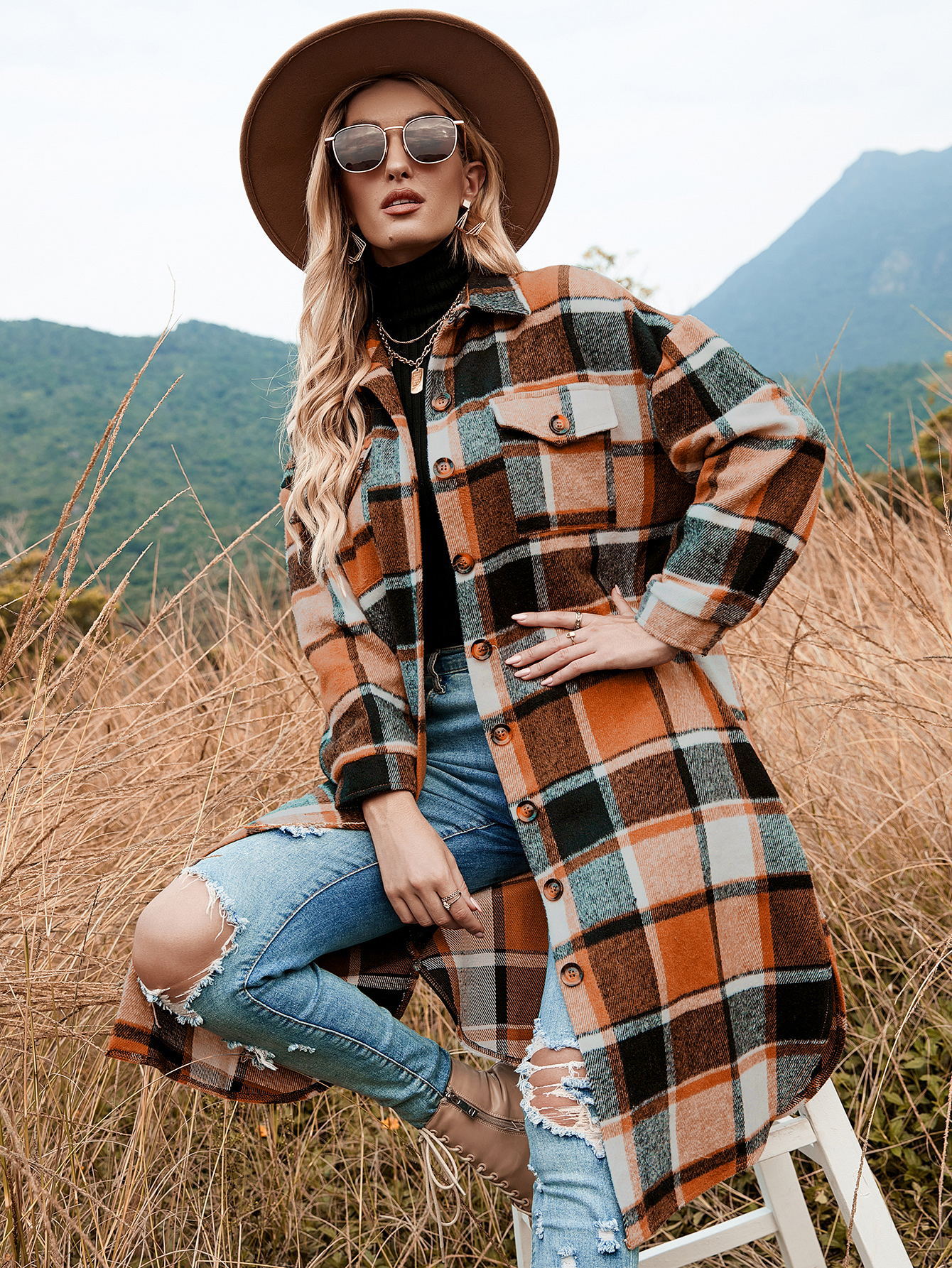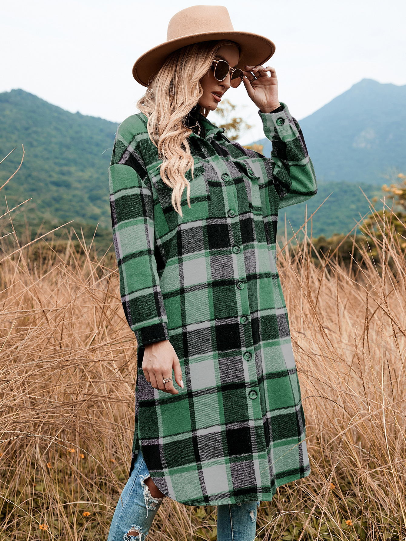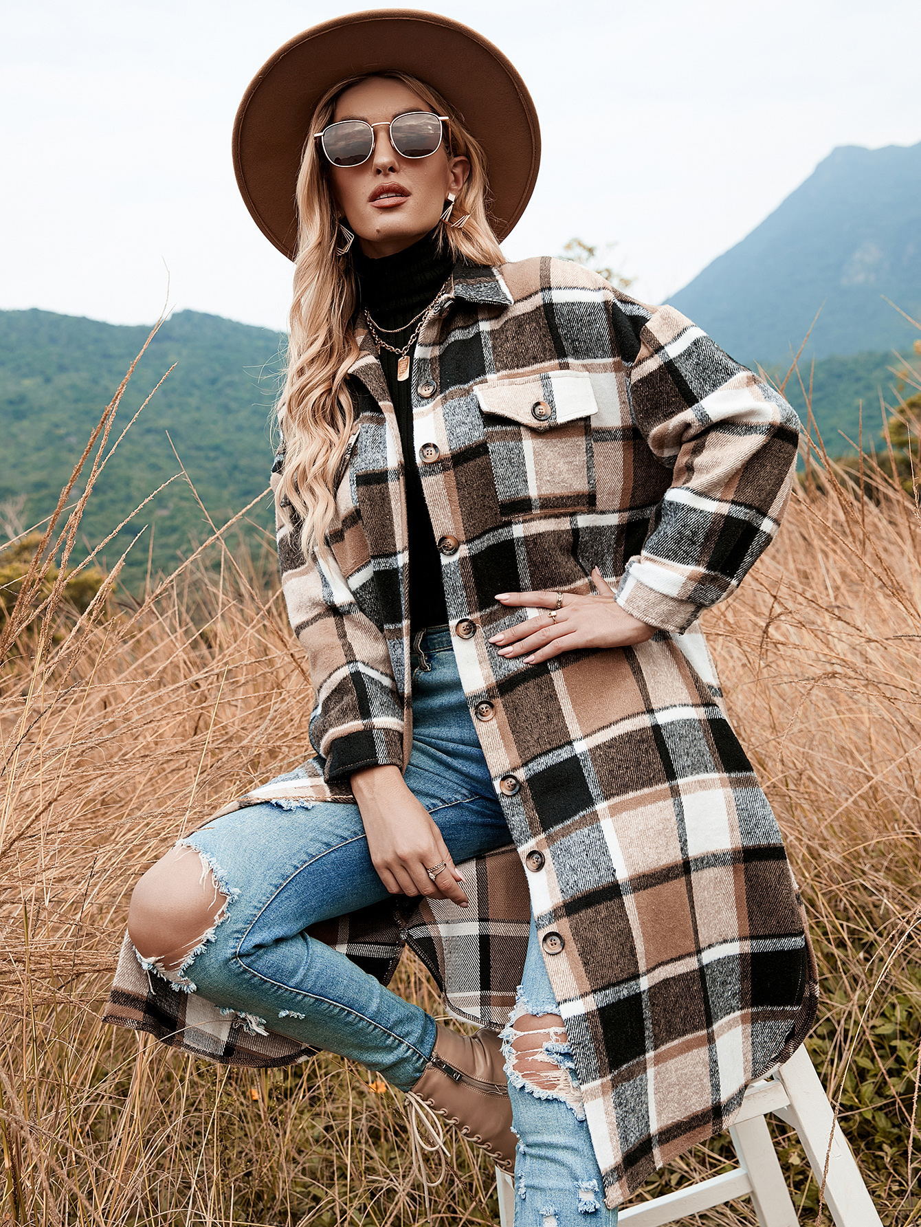 2022 Autumn and Winter European and American Style Windbreaker Jacket Side Slit Lapel Loose Woolen Plaid Jacket Real Shot Ready Stock
