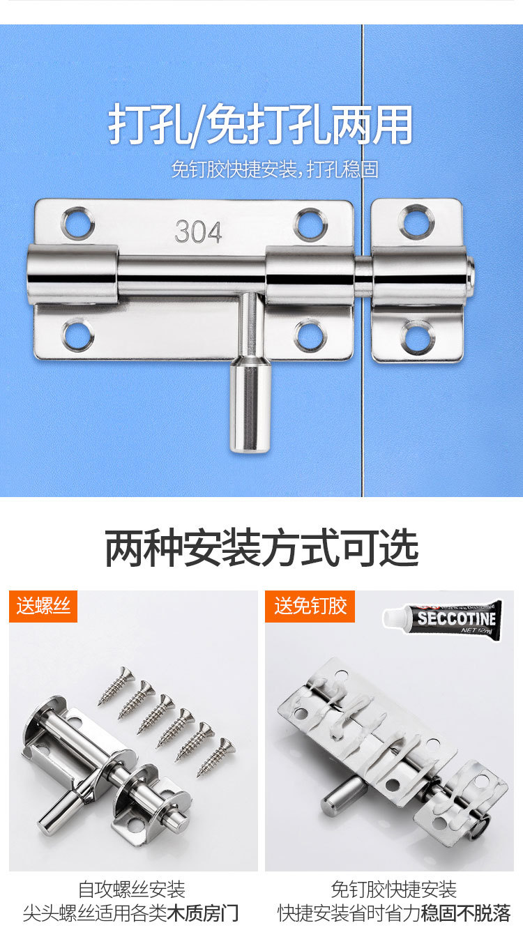 • 304 stainless steel bolt door bolt lock wooden door anti-theft bathroom thickened open-mounted room door latch sliding door buckle