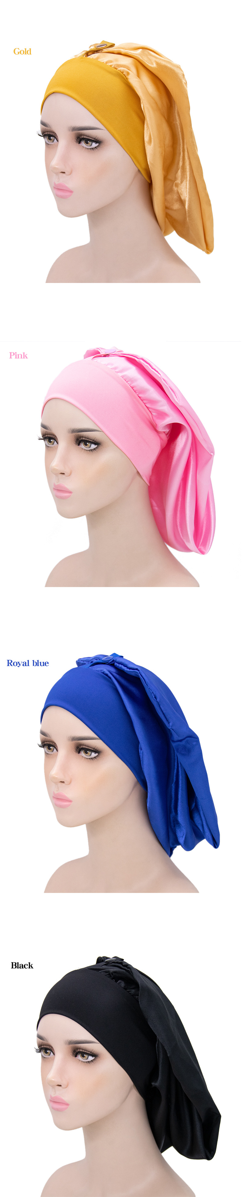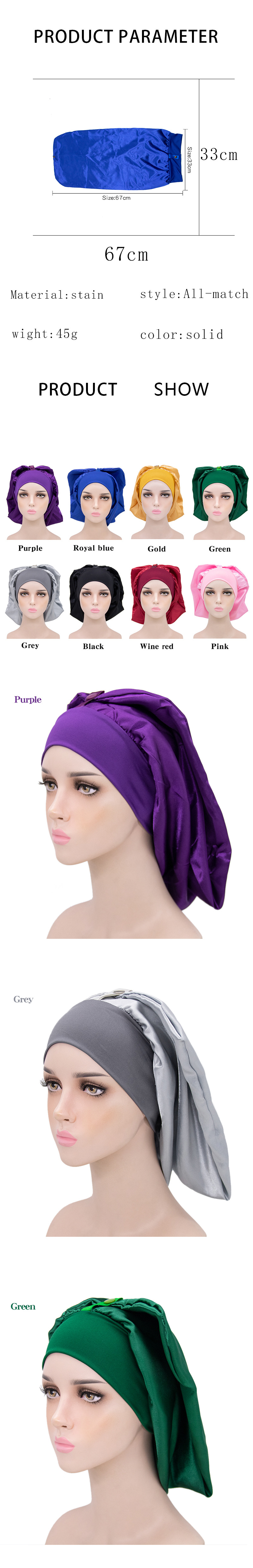 • Amazon Hot Sale Metal Snap Long Barrel Sade Nightcap Solid Color Wide-brimmed Elastic Shower Cap Adult Chemotherapy Cap
