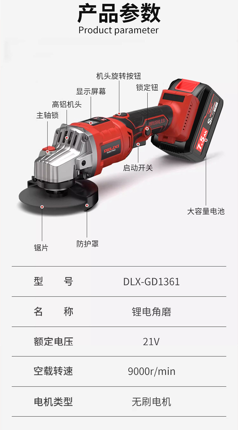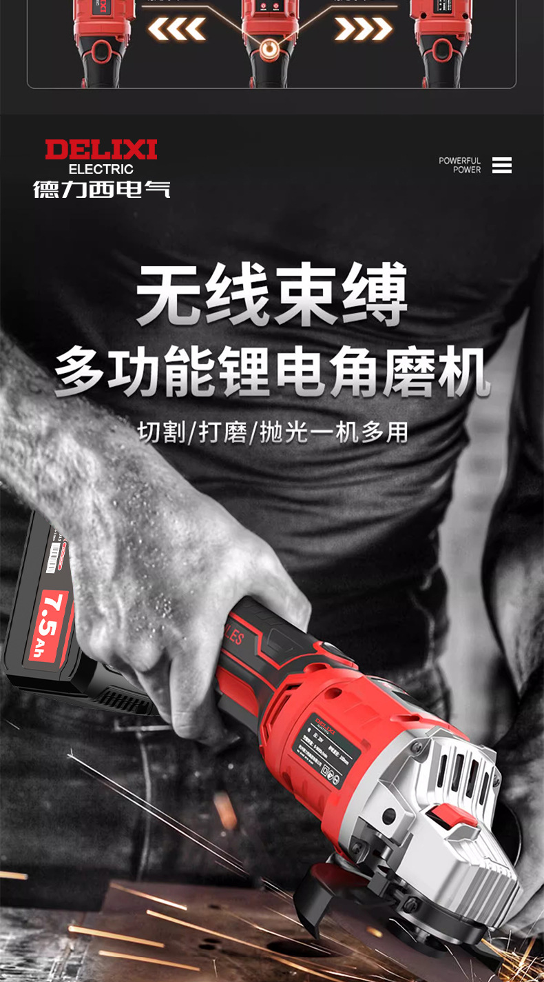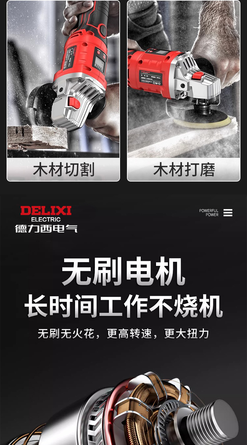 • Delixi brushless lithium-ion angle grinder rechargeable pool high-power cutting machine grinding hand wheel electric grinder