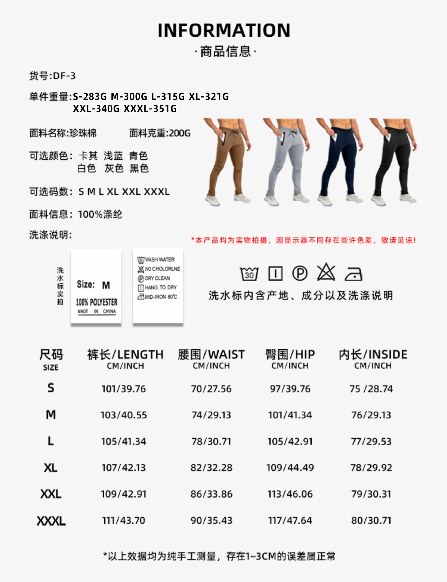 单件(套)净重:S:279g,M:285g,L:288g,XL:298g,2XL:326g,3XL:337g