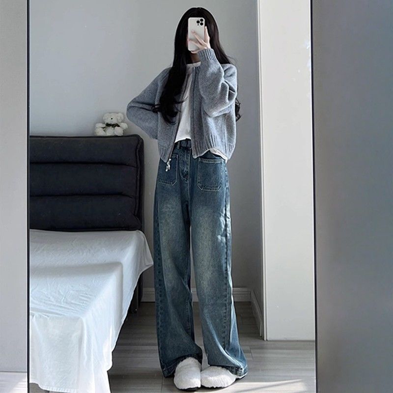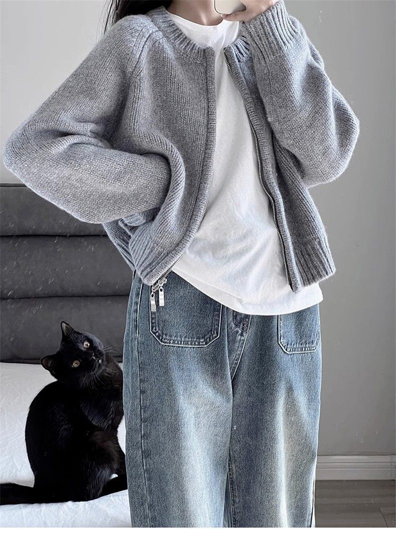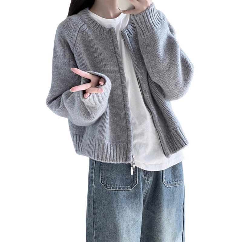 • Grey short coat women's autumn and winter 2023 new loose zipper sweater cardigan long sleeve knitted top