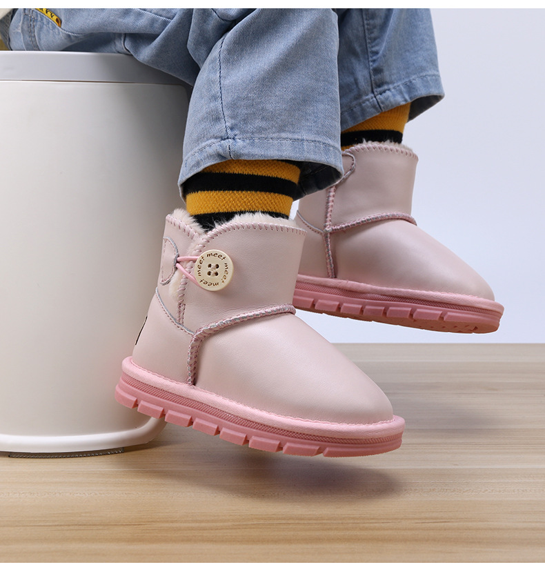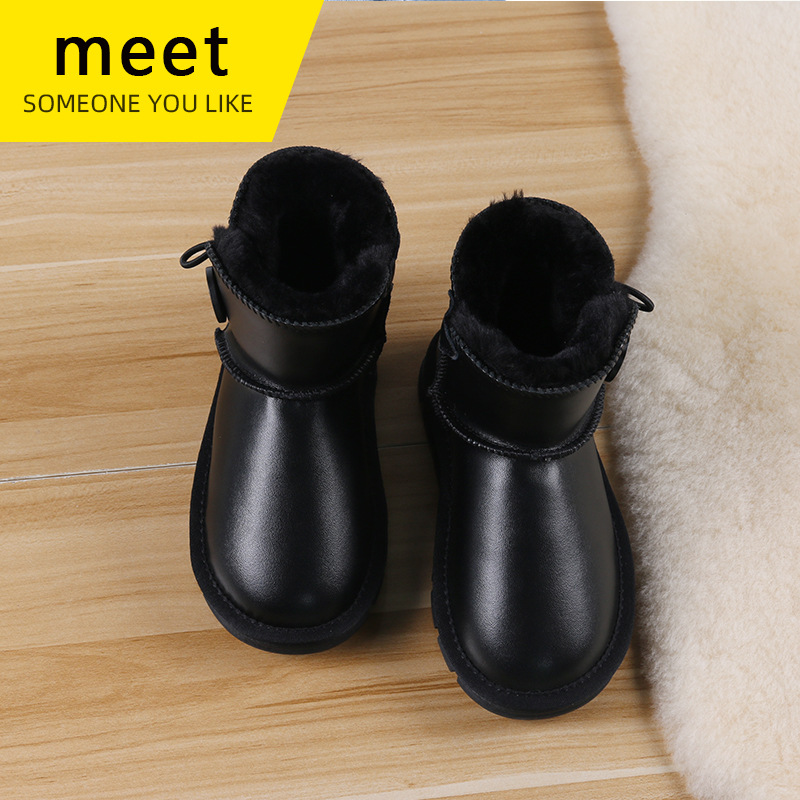 MEET Bright Leather Children's Snow Boots Winter Baby Shoes Non-Slip Thickened Children's Boots Beef Sole Fleece-Lined Children's Cotton Shoes