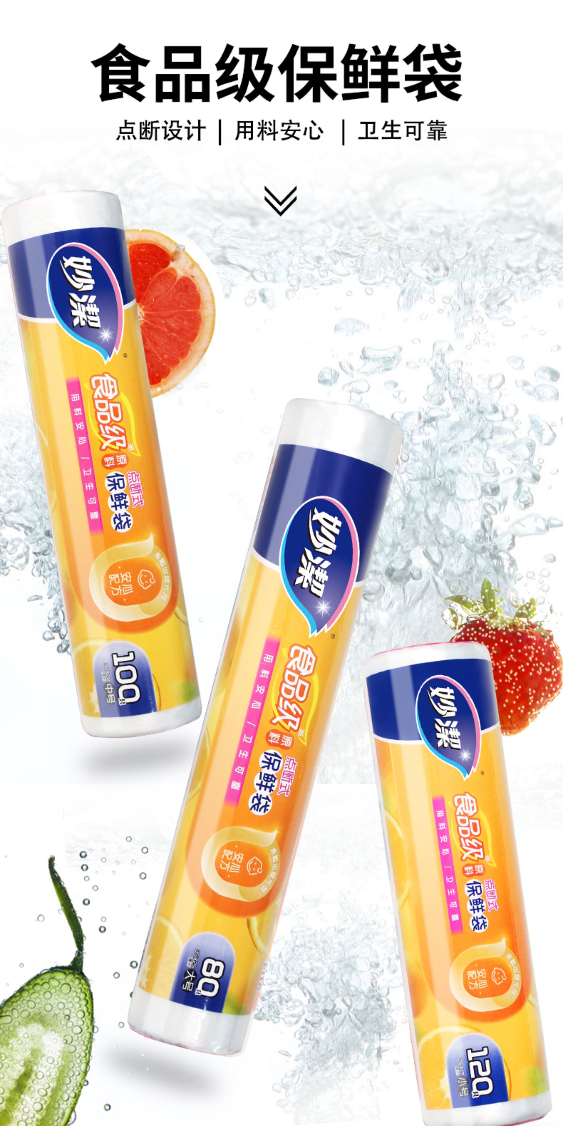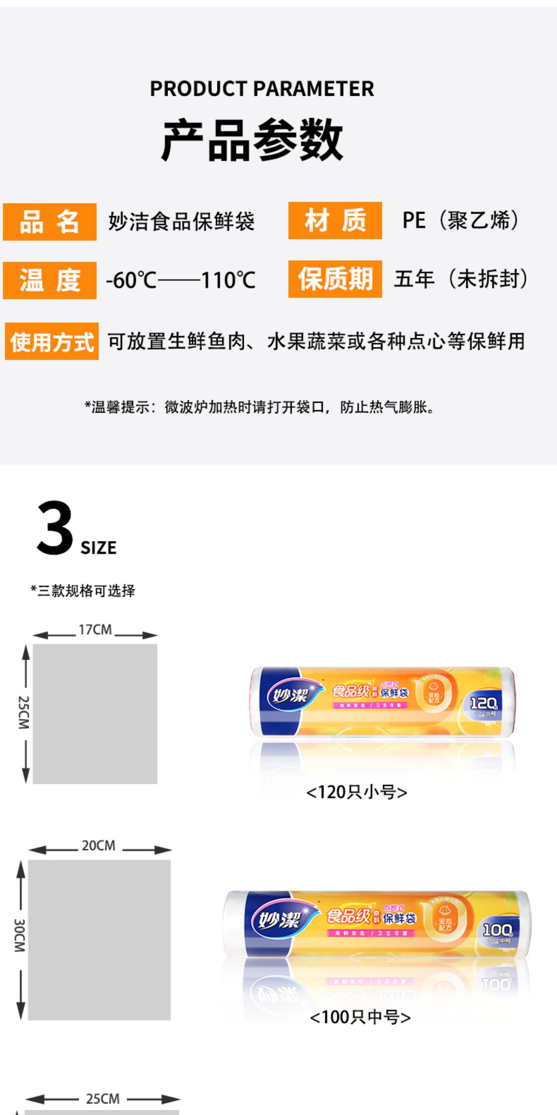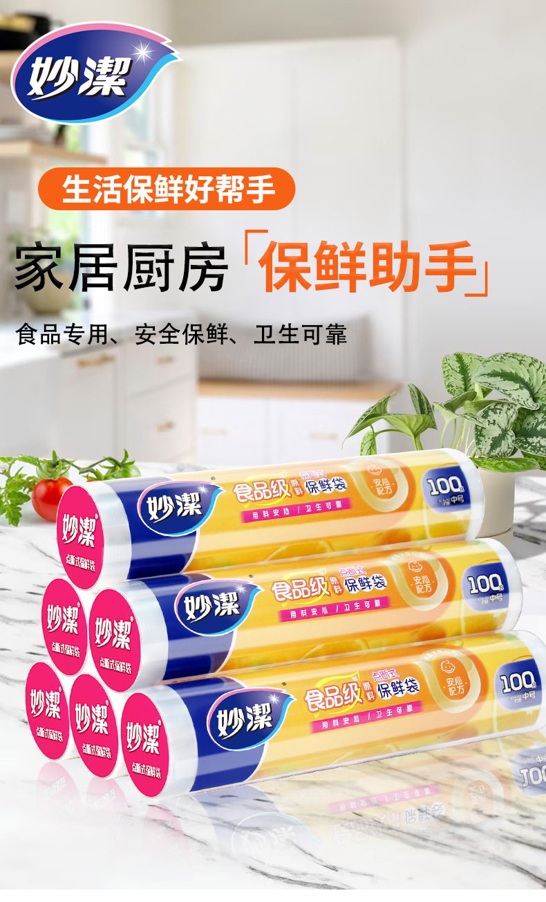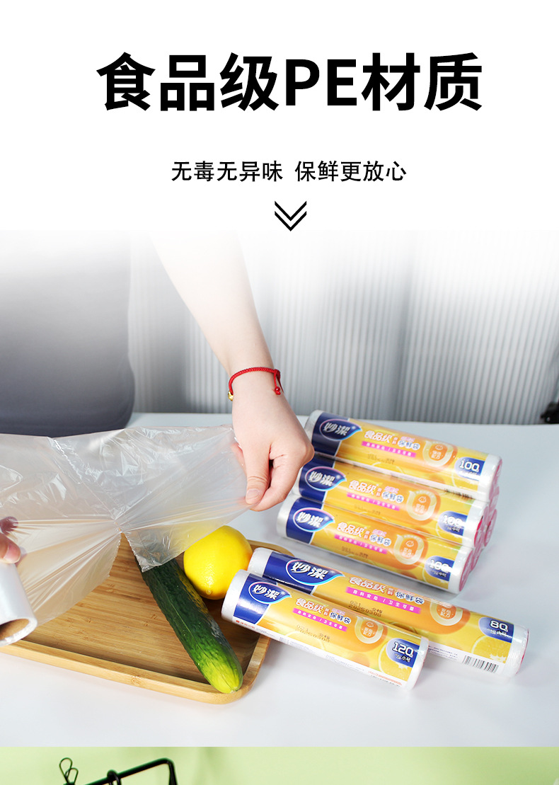 Miaojie Fresh-Keeping Bag Household Thickeneded Food Bag Hand-Tearable Bag with Roll Bag Large, Medium and Small Point-Break Type Fresh Lock Economical Packaging
