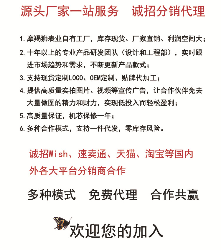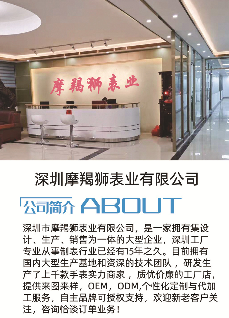 本公司拥有优良的专业技术人才,有雄厚的专业底子,更有精密准确的日本.瑞士专业生产设备,从啤胚部到表壳.表带的生产,以及字面的设计生产到成品的装配,形成一条龙的大型生产线。由于工艺的精湛,质量的过硬,价格的合理,服务的完善,我们的成表产品畅销东南亚及阿拉伯,非洲。此外,我们还为一些知名的品牌企业定制品牌手表,配合客户实现产品多元化的发展战略。我们更善于根据各个企业产品特征为广大客户设计制作各种广告礼品表,如品牌形象表。产品促销表。商务礼品表。纪念表等,协调客户提升品牌价值。