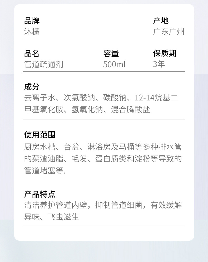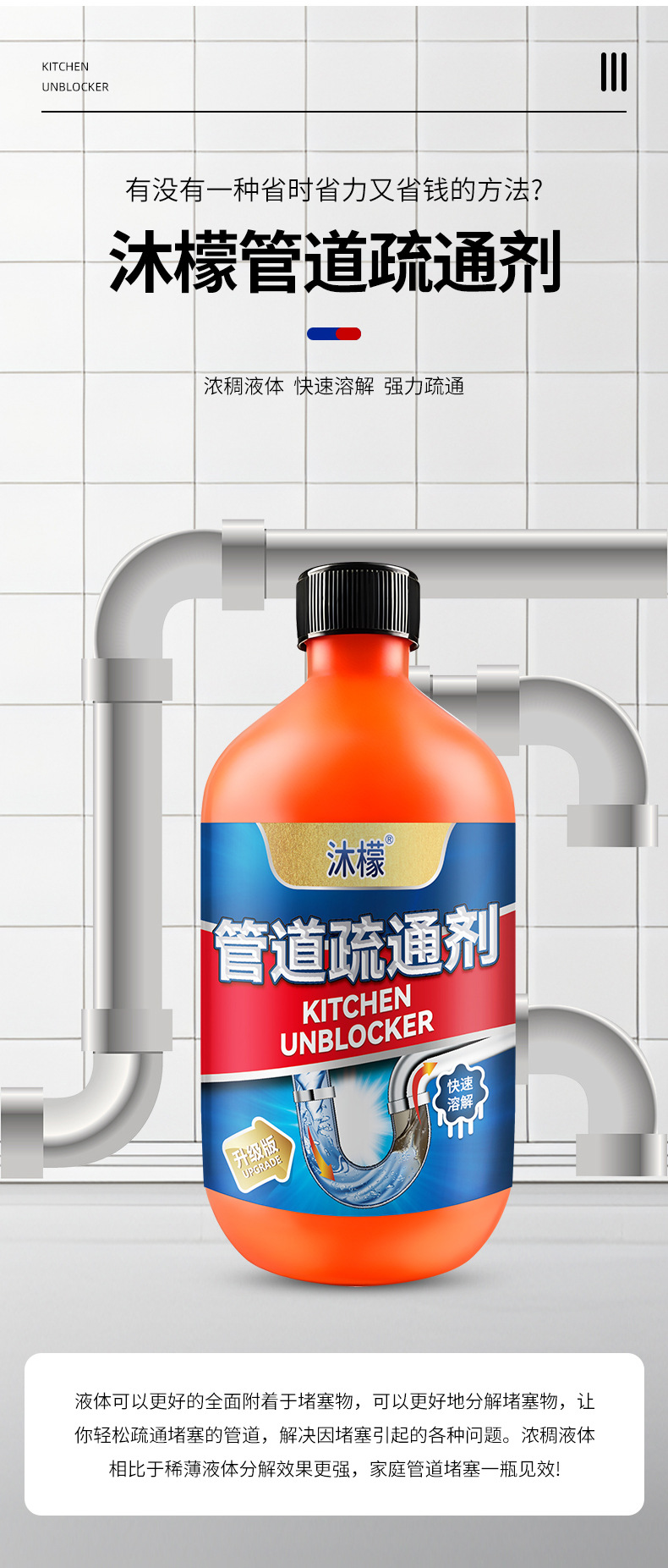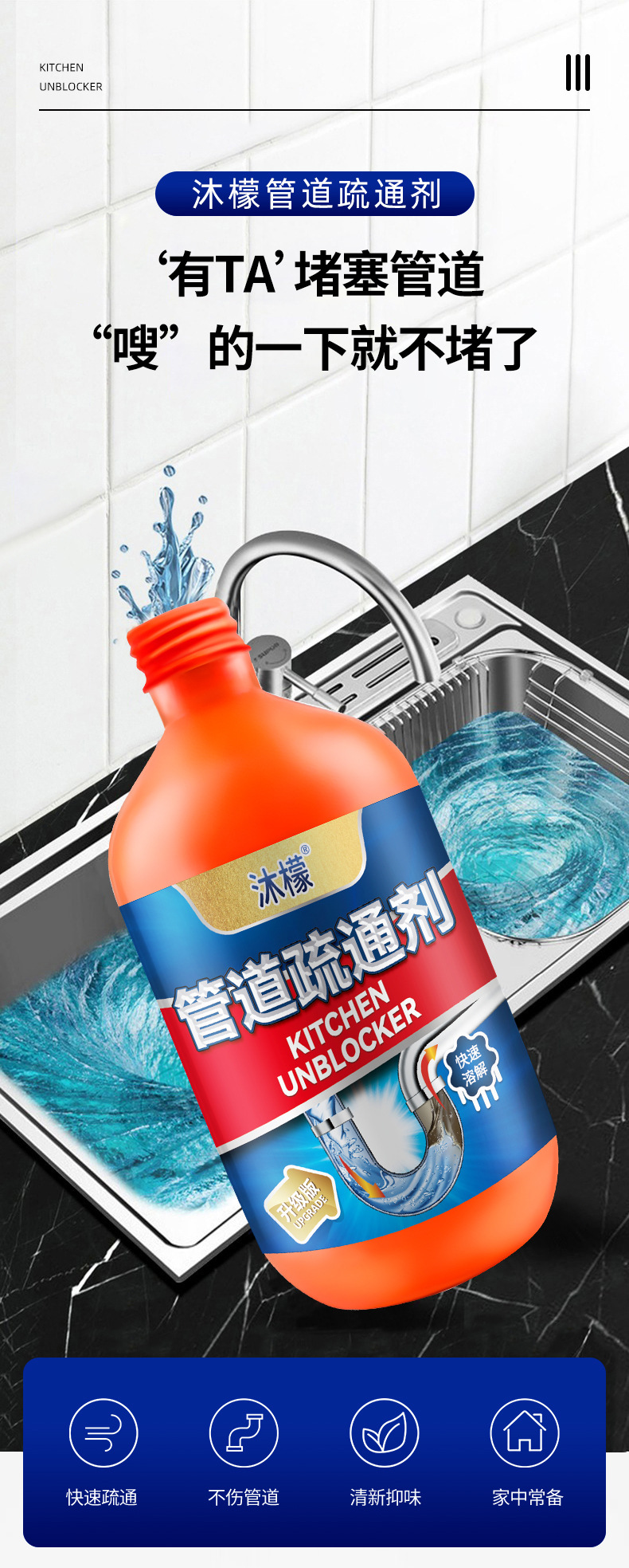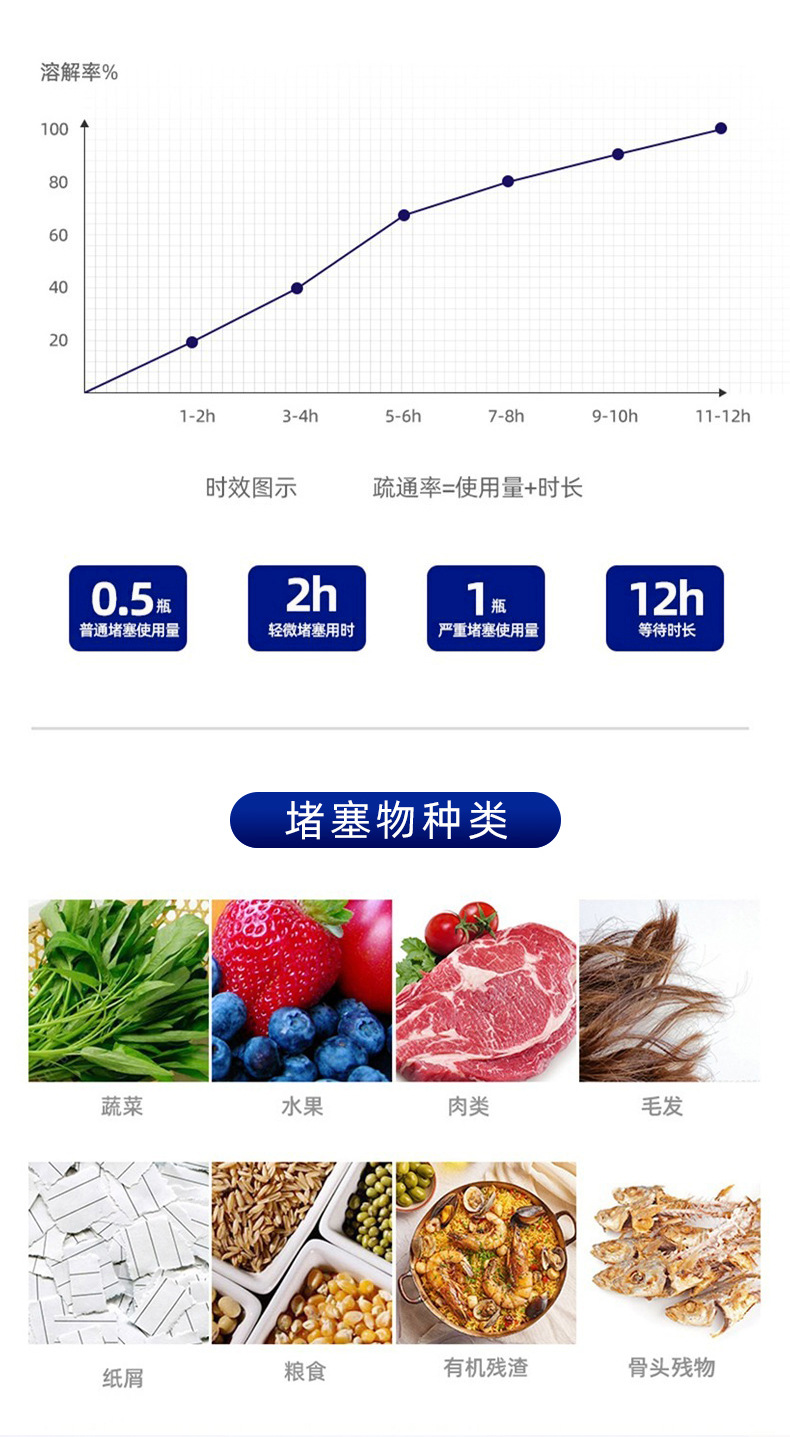 功效:快速溶解毛发、菜渣、油脂等堵塞异物