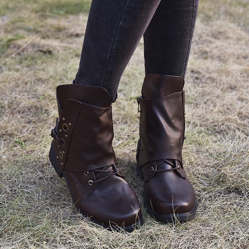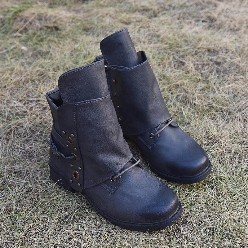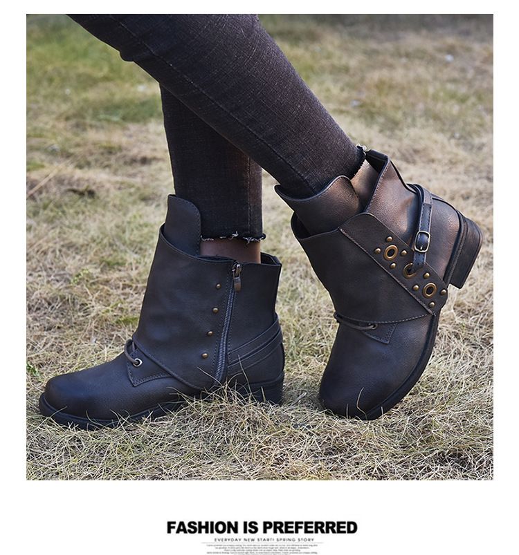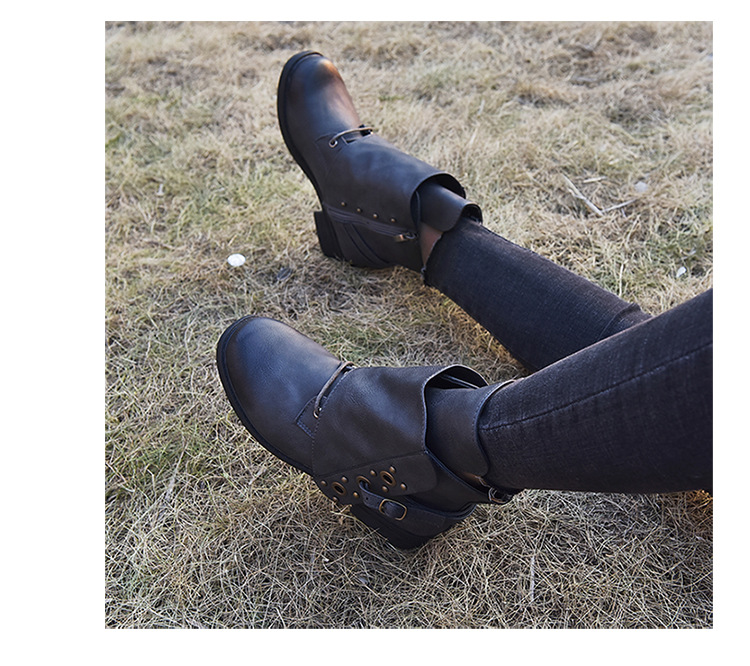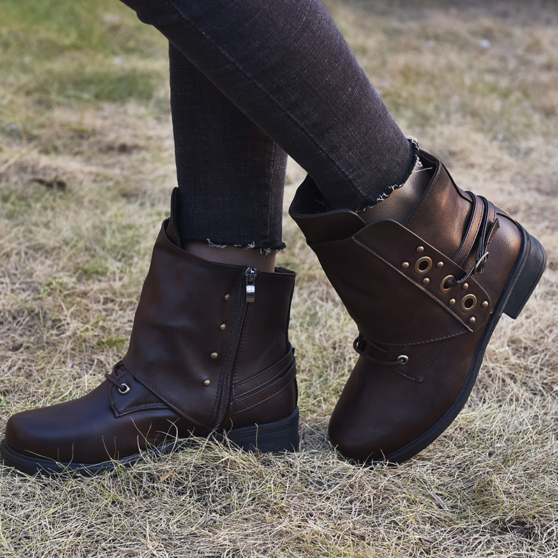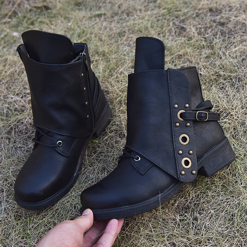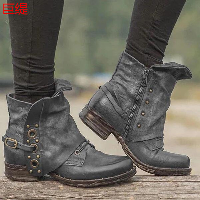• 2020 New Autumn and Winter Wish Amazon Independent Station Large Size Retro Round Toe Side Zipper Women's Leather Boots