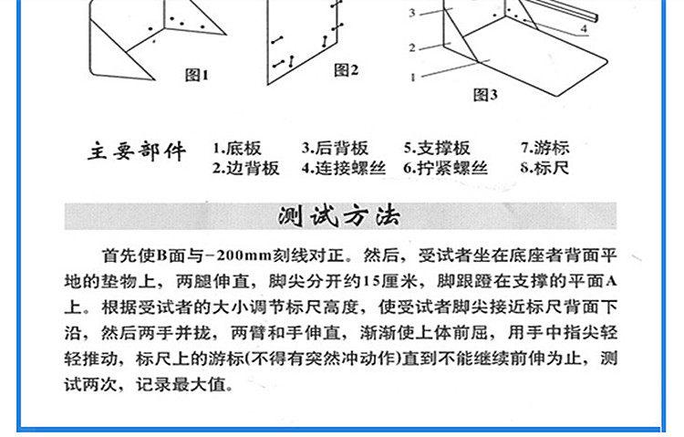 测试方法:受测者赤足,坐于垫上,两腿伸直,足并拢,足尖分开约10-15cm,足底紧贴在支座立板上,然后两手并拢,手臂伸直,指尖轻触测试游标。使上体前屈,手指平推测试游标向前缓慢滑动,切忌突然加速,待游标不能再继续前移时,显示测试结果。